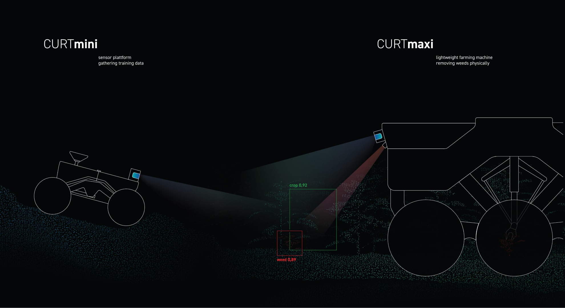 curt maxi is an autonomous agricultural lightweight robot addressing the future needs of farming without pesticides, as actuators physically remove the weeds. trained algorithms analyse images and distinguish between weed and crop.
